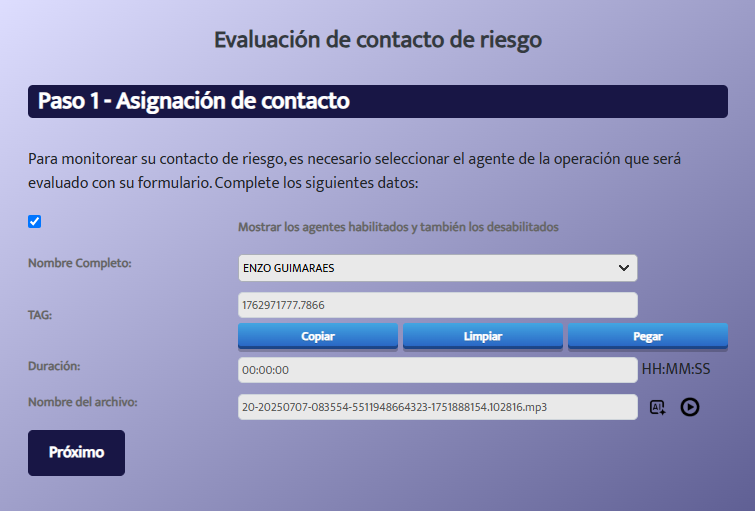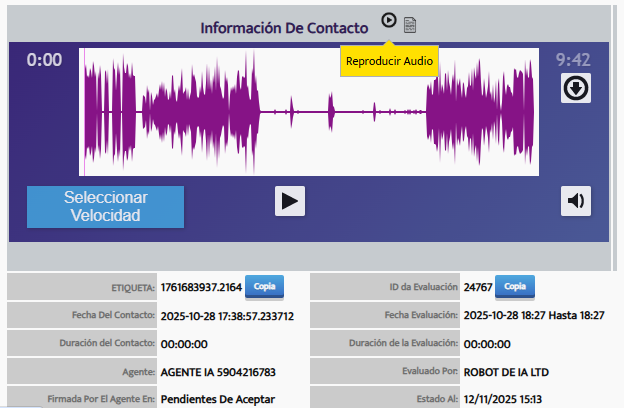 En la tabla, selecciona el nombre del agente que deseas evaluar, la información sobre el contacto y, justo debajo, en el campo “Nombre del Archivo”, aparecerá el nombre y el botón del audio (archivo).