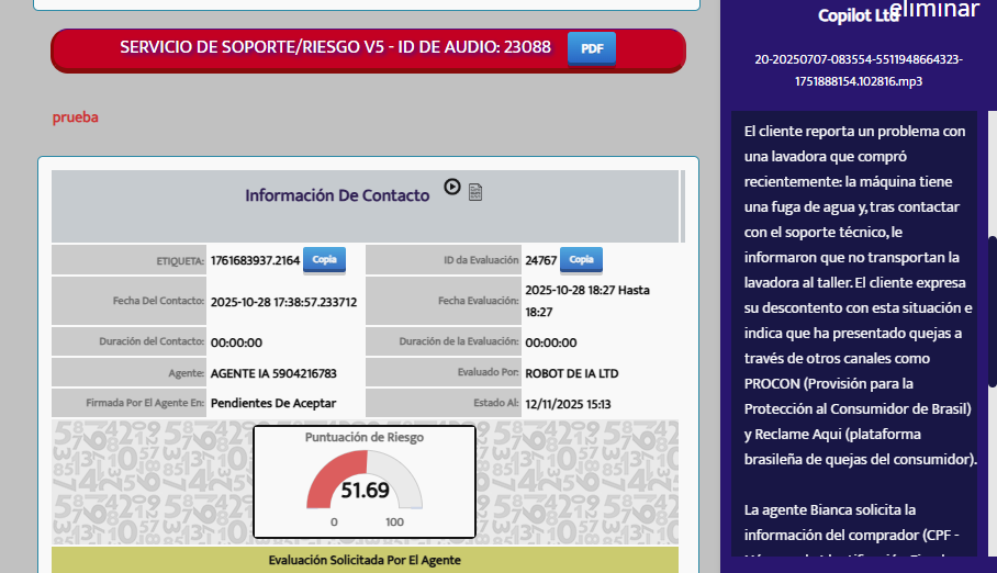 En la imagen mostrada, se ve el resultado del monitoreo de riesgo, la respuesta de la IA en cada ítem, la fecha, el ID de la llamada, el horario, la puntuación de riesgo…