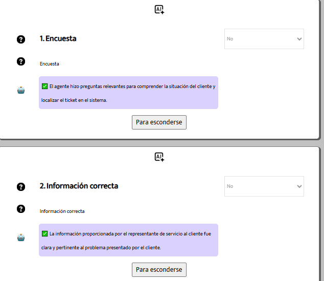 | Empatía y Tono de Voz | ¿El agente mostró falta de empatía, fue rudo o utilizó un tono inapropiado? | 8 | |
